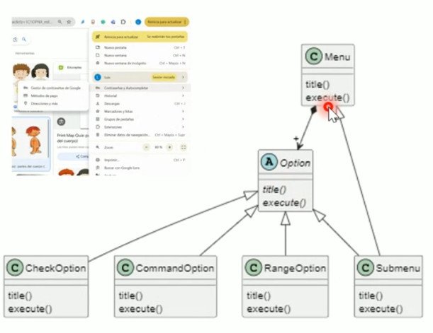 Gracias por su respuesta profesor, pero me refería a esta segunda imagen donde el profesor Luis cambia el diagrama. Esta e el minuto 01:11:47.Según mi interpretación del diagrama, Menu se compone de Option y Submenu hereda de Option.